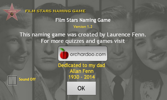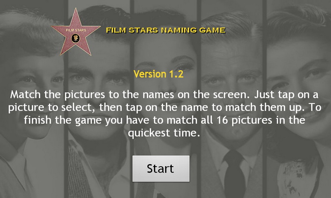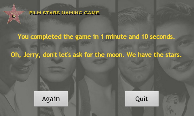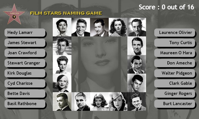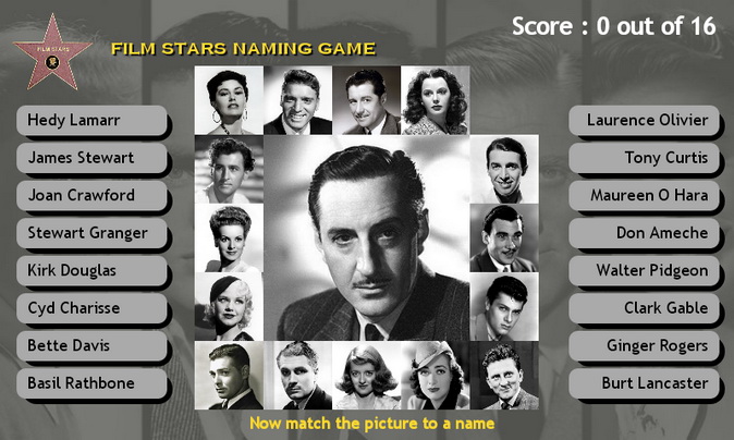 Not based on any of my previous games, this is about matching the picture to the name of the film star from the 1940s. You click on the picture to select it and move it to the middle of the screen, then click on the button with their name. Complete the game in the quickest time.
