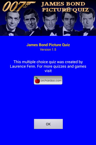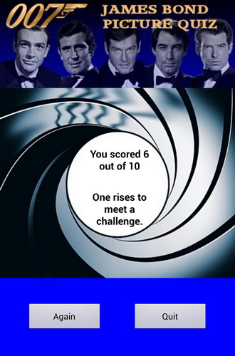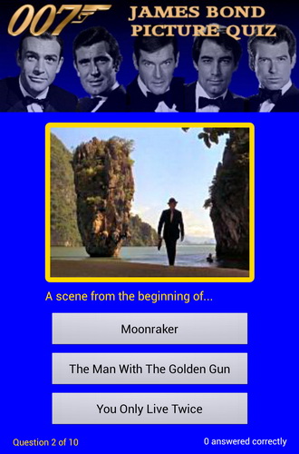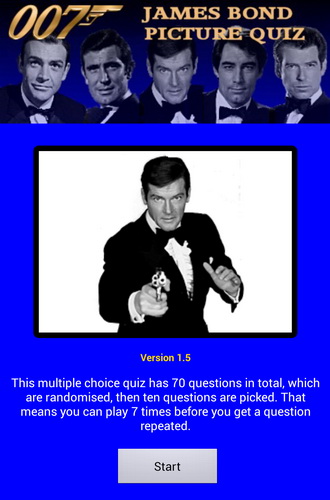 Based on my original Javascript quiz, this game has 80 questions about James Bond (the first five). Each game has 10 questions picked at random from all the questions, which means you can play 7 times before you see a question again.