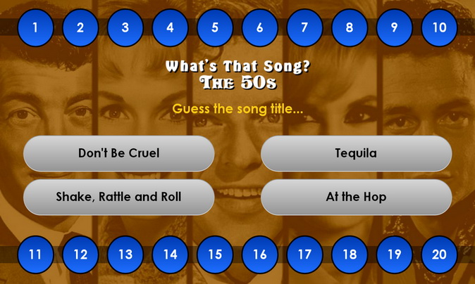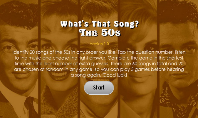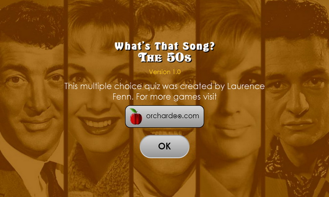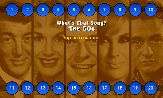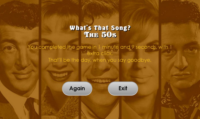 Based on one of my Flash/mp3 games, this game is about the music of the 1950s. You have 20 clips to identify either the artists or song title in the quickest time with the least number of mistakes.