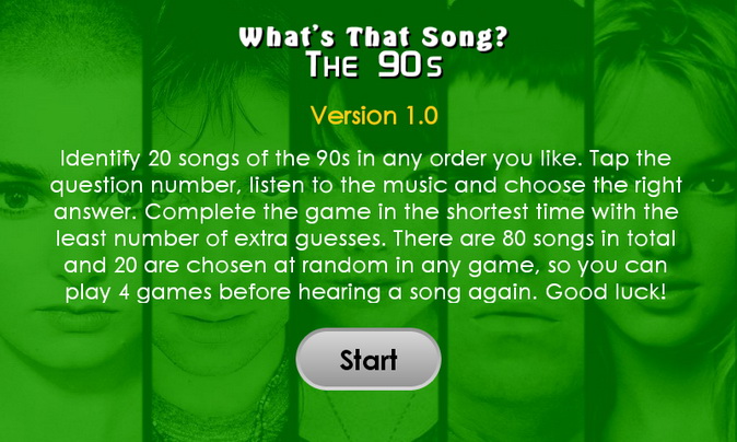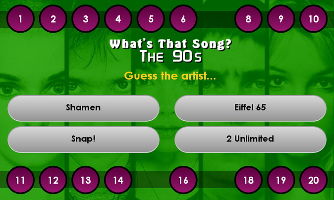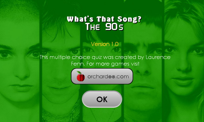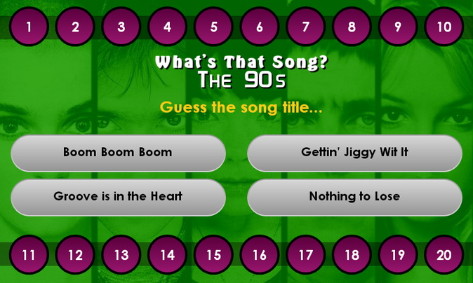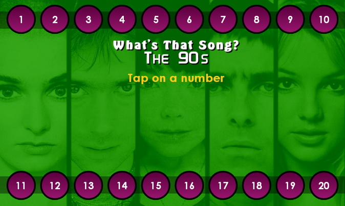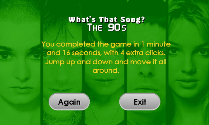 Based on one of my Flash/mp3 games, this game is about the music of the 1990s. You have 20 clips to identify either the artists or song title in the quickest time with the least number of mistakes. There are 80 questions in total so you can play 4 times before you hear a song again.