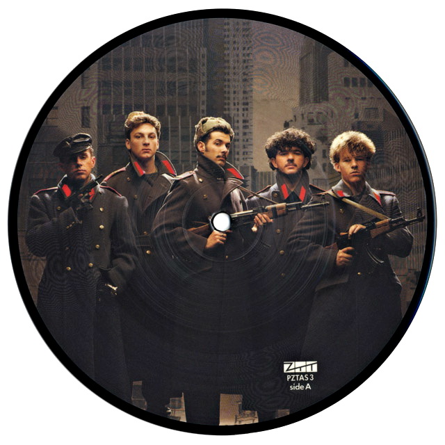 The three head logo from four of the Thompson Twins 12" singles, the white vinyl double groove 10" of Basia's Promises, Octopus' Jealousy double groove