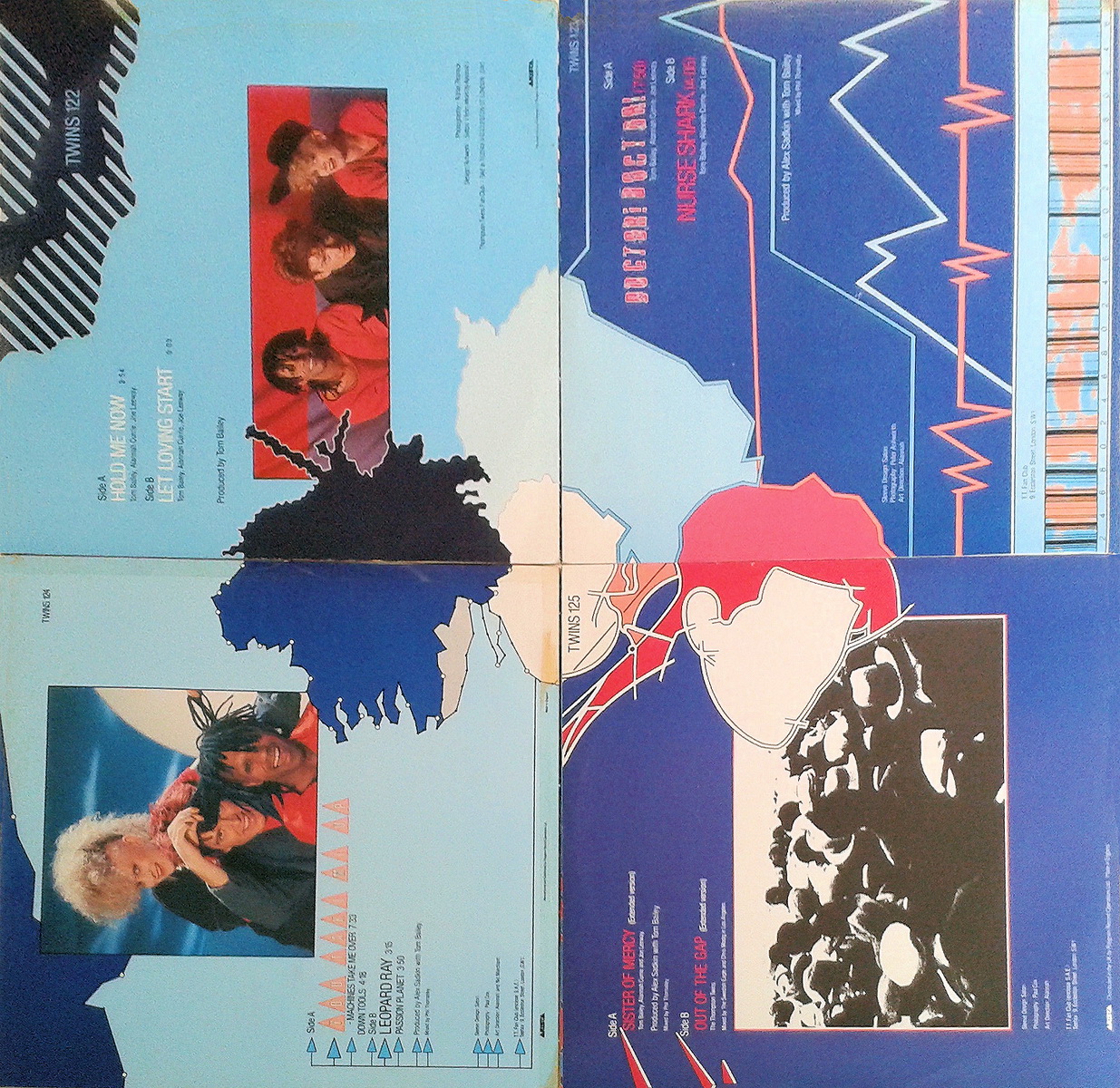 Other labels would maybe only release two 12 inch singles with the single mix, b-side and maybe an instrumental on one and multiple remixes on the other. Some groups would encourage fans to buy their singles by incorporating a design that built up with each single. The Thompson Twins had their three head logo that was built up from the back cover design of the singles from Hold Me Now, Doctor Doctor, You Take Me Up and Sisters of Mercy.