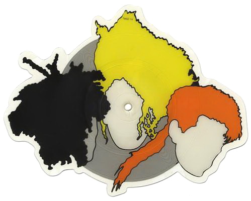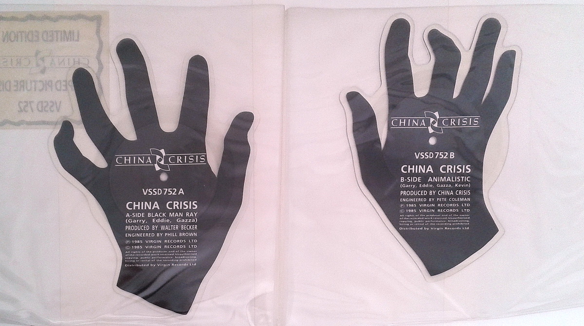 In the 1970s the picture disc started to appear. Thicker that the standard 7 inch single, this had a picture on both sides of the record, and was actually a sandwich of paper with the pictures on top of a black vinyl, covered with clear vinyl so the detail showed. Some record labels combined this with a cut-out shape. China Crisis released two record picture discs in the shape of hands for their single Black Man Ray.