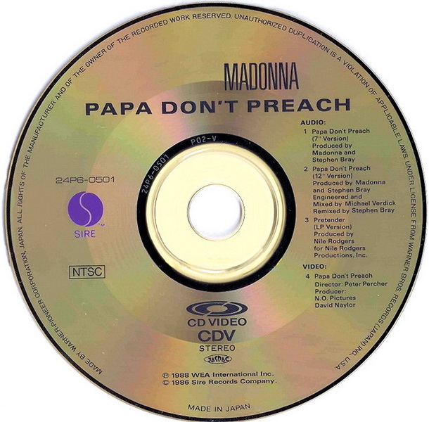 CD-Video (also known as CDV, CD-V or CD+V) was introduced in 1987 and combined the technologies of compact disc and LaserDisc. CD-V discs were the same size as a standard 5 inch audio CD, and contained up to 20 minutes worth of audio information that could be played on any audio CD player. It also contained up to 5 minutes of analog video information plus digital CD-quality sound, which could be played back on a newer laserdisc player capable of playing CD-V discs. They were gold in colour to distinguish them from standard audio CDs, but despite releases from artists like Bananarama, Level 42, Wham and Madonna they only lasted four years.
