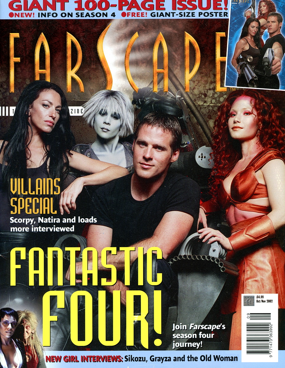 The official magazine only ran for twelve issues, but the US and UK versions had different covers and there was also a special edition of each issue which had a different cover. In this giant 100 page issue was a giant poster, news on season four, a report on a convention in Sydney, Austrailia, three new female characters (Sikozu, Grayza and Noranti), and a Q and A with Tammy MacIntosh (Jool). There's a story on the puppeteers, a large section about the villains in the show, a behind the scenes on a two parter episode from season three, a short story (Home Alone), a letters page and an extract of one of the scripts. The magazine cost £4.99 and adverts include the Farscape PC Game and the illustrated season companions books at £9.99 each.