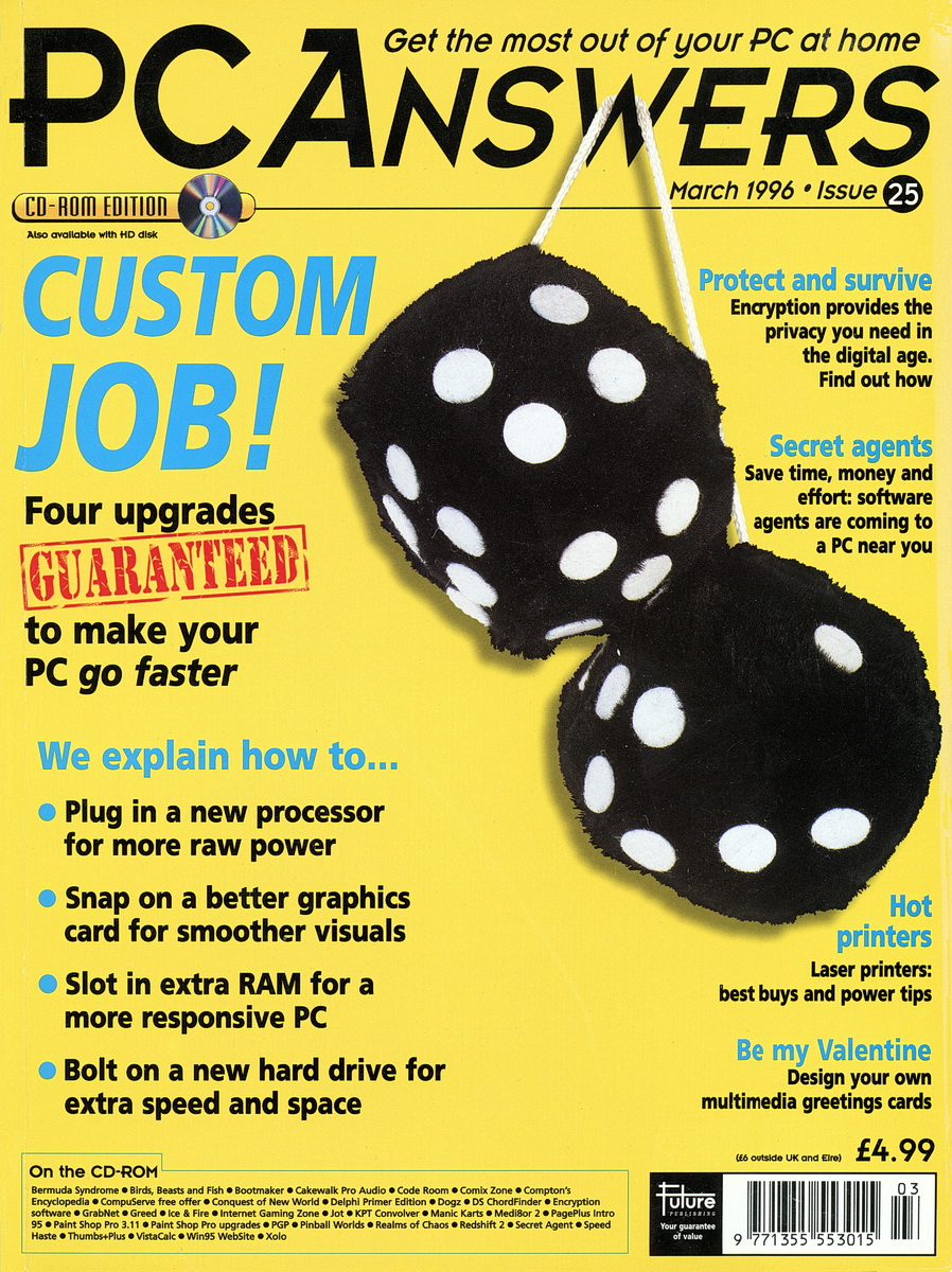This magazine covered the more technical aspects of PCs, and came with either and HD disk or CD-ROM. This issue included the shareware version of PaintShop Pro 3, when it was still owned by Jasc. I have used the software from version 2 up to the latest one at the time of writing X8, by Corel. In the news section it advised you not to buy an MPEG decoder card, as the new Intel Pentium P55C would be powerful enough to play videos and VideoCDs. There were reviews of LaserJet printers, a detailed feature on CD-ROM technology, reviews of TekWar and The Dig, a letters page and tips on customising Windows 95. The last issue was in October 2010, number 217. The magazine cost £4.99 and adverts included the Black Widow ScanPro flatbed scanner at £259 (+VAT) and the Notino Voyager 45 laptop for £2,608.50.