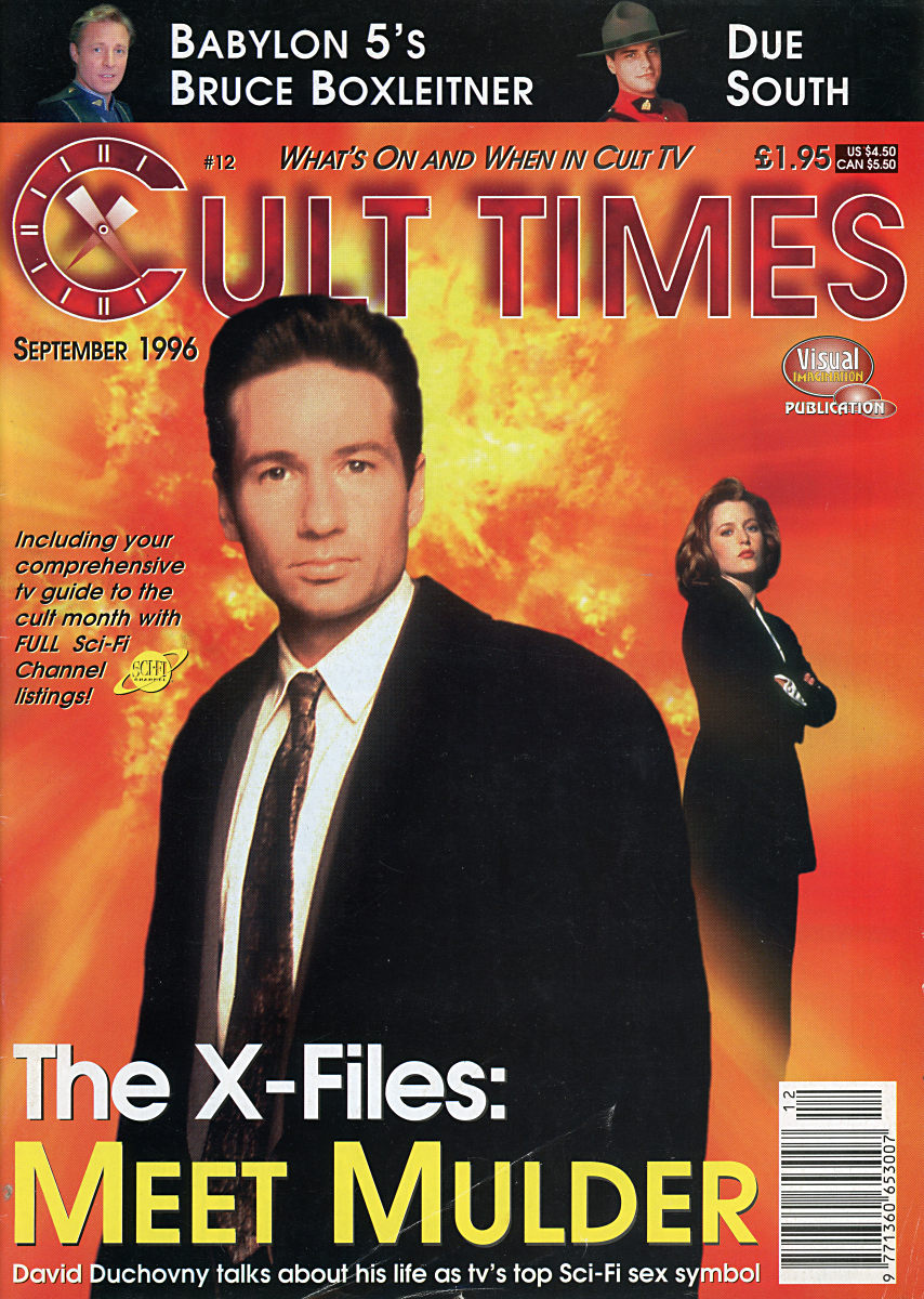 This magazine is similar to TV Zone and ETV (which is advertised on the inside front cover) and covers programmes like the X-Files, Babylon 5, Due South, Fantasy Island, The Incredible Hulk and Neverwhere. There's news of the new series Dark Skies to be shown in 1997, the Cult TV 1996 convention in Haven Calster Holiday Centre in Norfolk on 25-28 October, featuring Gil Gerard, Ed Bishop and Norman Lovett, with registration only £39. The X-Files interview is with David Duchovny, the Bablyon 5 one is with Bruce Boxleitner. Out of the Box is a 30 page TV listings guide for the whole of September, for terrestrial, cable and satellite channels. Sky 2 shows the first series of Sliders again (there's a colour poster of Jerry O'Connell as Quin Mallory in the magazine), the Sci-Fi Channel shows Tales of the Unexpected (currently being repeated on Sky Arts on Freeview at the time of writing) and BBC2 are showing UFO, Neverwhere and Star Trek: Deep Space Nine. Each page is a day and the listings are in time order, so it's a bit confusing trying to find programmes if you don't have access to all the channels. There's some more interviews and at the back there is Times Past, a section about what was worth seeing and missing last month. Thumbs up for The X-Files, Hammer's House of Horror and the premiere of Stargate the movie on Sky, but thumbs down for Automan, although they didn't say what channel it was on.