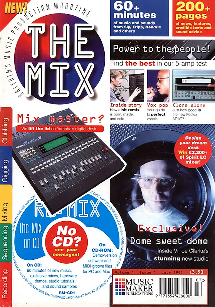 The new name for Music Technology magazine (which was Electronics & Music Maker) it steared more towards mixing music (hence the name). The cover CD didn't come in a jewel case, but they did print a cover for you to cut out and put in a standard case. Still, one of the rival magazines at the time, Future Music, managed a proper jewel case for their CD. The disc is mixed mode and the CD-ROM has some demo software and MIDI files for PC and Mac. The audio tracks include demos of the Roland GR09 guitar synth, some sample loops, four mixes of Visage's Fade to Grey (crossfaded and not complete) and some exclusive mixes of tracks by This Beautiful People and No Man (never heard of them myself). The magazine has interviews with Dieter Meier from Yello, Vince Clarke, a piece about the stage show for East 17, a full review of the GR09 (£749), the Sound Blaster 16 card for PC (£219), the Yamaha ProMix 01 (£1878), the Tascam M2600 mixer (£2499-£3799), the Kam GM25 DJ mixer (£99.95) and the Fostex RD8, 8 track ADAT digital multitrack (a snip at £4559). Adverts include the Alesis QuadraSynth (no price), Roland S-760 rackmount sampler (no price) and the Korg X3 Workstation (£1249).