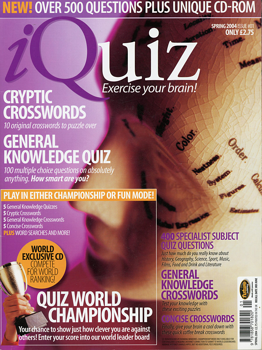 What started as a new publication turned out to be the only issue, and it's nothing to do with a certain fruit named technology firm either. There are three pages describing the unique and world exclusive CD-ROM, two phrases that seem redundant. The disc has 5 sets of 4 different crossword types, plus word searches and jigsaws. If you play the crosswords in competition mode you can enter your name and town and enter your score to the world league (they were abitious if nothing else). Then in the magazine you have 10 Cryptic crosswords, 10 General Knowledge ones and finally 10 Concise ones. Except you don't; there are 10 cryptic ones, but only 4 general knowledge ones and 11 concise ones. I checked that the answers near the back are correct but mislabelled. Then there is a 100 question multiple choice quiz, 50 questions on literature and language (the last ten are super hard), 50 questions on film and television, 50 on food and drink, 50 on geography 50 on science, maths and nature, 50 on history, 50 on music and 50 on sports, games and pastimes. Scattered amongst these are adverts for books and websites, boxes with facts about chocolate, the different champagne bottle sizes, the Bond filmography and other interest stuff, like the longest serving actress in Hollywood (Lillian Gish, who was credited in films from 1912 to 1987). The answers section has a little bit of extra info with the answers and the last page has a 20 question quiz about quotations. I suspect it would only be published four times a year as this issue is marked as Spring 2004, but even then I think they would have had difficulty generating the questions.