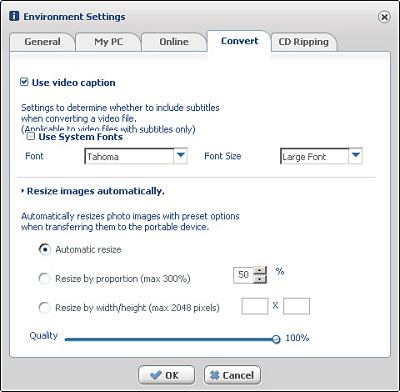 On the PC, the Samsung Media Studio program is not the most stable of software. It can automatically start when the device is connected with the USB cable, but you have to add music to the collection before transferring it. You cannot just browse to a folder where your mp3 or wma files are and drag them onto the device with the software itself. It also seems to think that you will use the software to play your existing music collection on your PC. As I said before, I archive my mp3 files to CD, and I did manage to select the CD drive as a folder, and so transfer music from the CDs to the device without adding them to a library. Unfortunately some of my older CDs are a little worn, and the software just froze when it couldn't read a file, instead of giving an error message. Worse than that, on a couple of occasions the player froze as well, requiring a reset through a button combination. I ran an update for the software, but that didn't seem to make any difference. On the Environment Settings dialog (that's options to you and me) part of the text does not go all the way across the dialog and partially hidden behind some text below it. It gives the impression that the software wasn't tested properly before release.