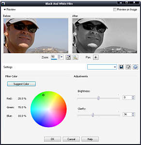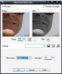 The Black and White Film effect has changed to give you a complete choice of filter colour. Before you only had a drop down of Red, Green, Yellow, Orange, Blue or None with a strength amount and two controls of Brightness and Clarify to adjust the contrast. The contrast of the final image can be enhanced and depending on the tone of colours certain objects will stand out more. The effect could also be done using the contrast or histogram function to change the tone, and then reduce the saturation; this does most of that in the one dialog.