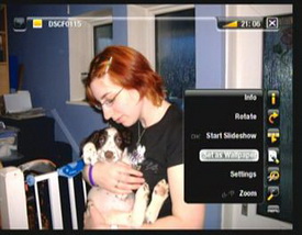 Photos are displayed with a nice fade between the pictures, and you can zoom in or out of the image. It can display JPEG, BMP or PNG picture formats. There is no card reader slot to plug in your memory card direct from your camera to view your photos. My Panasonic DVD Recorder has an SD card reader for exactly that purpose, and most digital cameras come with a cable to plug it into your television via a phono lead connection.