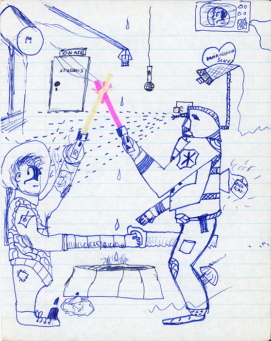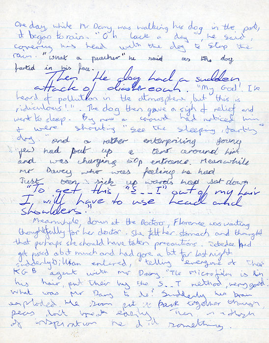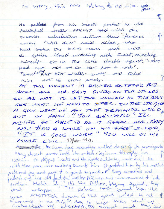 During Religious Studies, four of us sat in the front row of the classroom (well, the wooden shack like classroom which was opposite the music room). We didn't really pay much attnetion during class, but our teacher, Mr. Davy, didn't seem to notice. So during one boring lesson, Laurence Fenn, Chris Hawes, John Bolter and Scot Gardner decided to write a story. Each of us would write a paragraph or so, then pass it on to the next person to continue the story. Scot and I doodled the picture you see, which I have called the cover, although it bears no relation to the story. I found the original and scanned it :