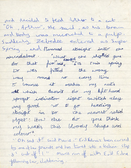 "Oh Arthur!" she said, as his brain and body was munched to a pulp. Suddenly Zebedee entered as Super Spring, and bounced straight into the roundabout.