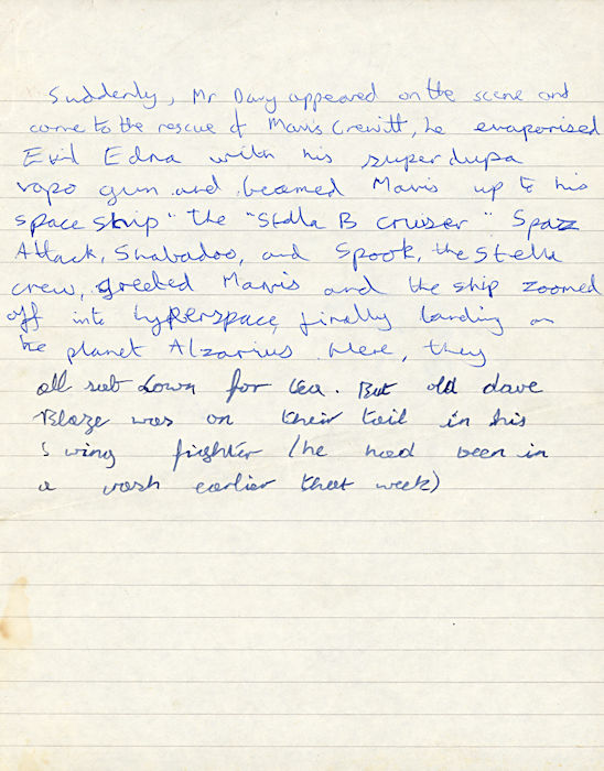 Suddenly, Mr Davy appeared on the scene and came to the rescue of Mavis Cruet. He vaporised Evil Edna with his super dupa vapo gun and beamed Mavis up to his spaceship, the Stella B Cruiser. Space Attack, Shabadoo and Spook, the Stella crew, greeted Mavis and the ship zoomed off into hyperspace, finally landing on the planet Alzarius. Here they all sat down for tea. But old Dave Blaze was on their tail in his B Wing fighter (he had been in a crash earlier that week).